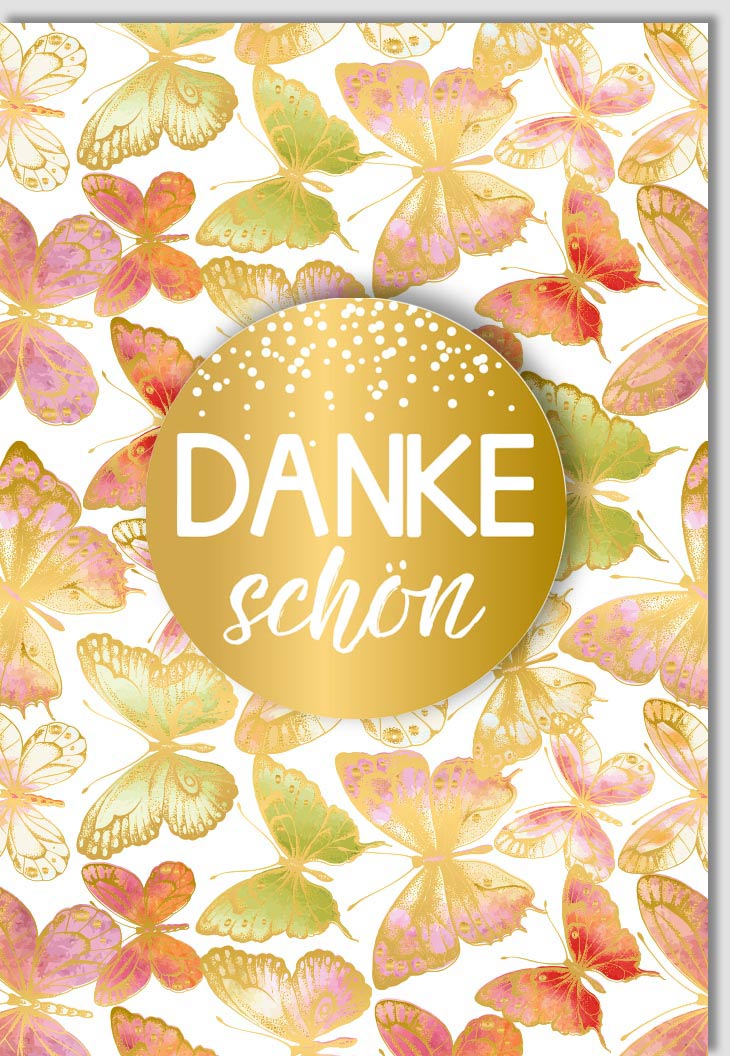 Diese elegante Danksagungskarte zeichnet sich durch ihr ansprechendes Schmetterlingsdesign aus. In warmen Farbtönen gehalten, ist der Mittelpunkt der Karte ein goldfarbener Kreis mit der Aufschrift "DANKE schön", was die Karte ideal für vielfältige Danksagungsanlässe macht.