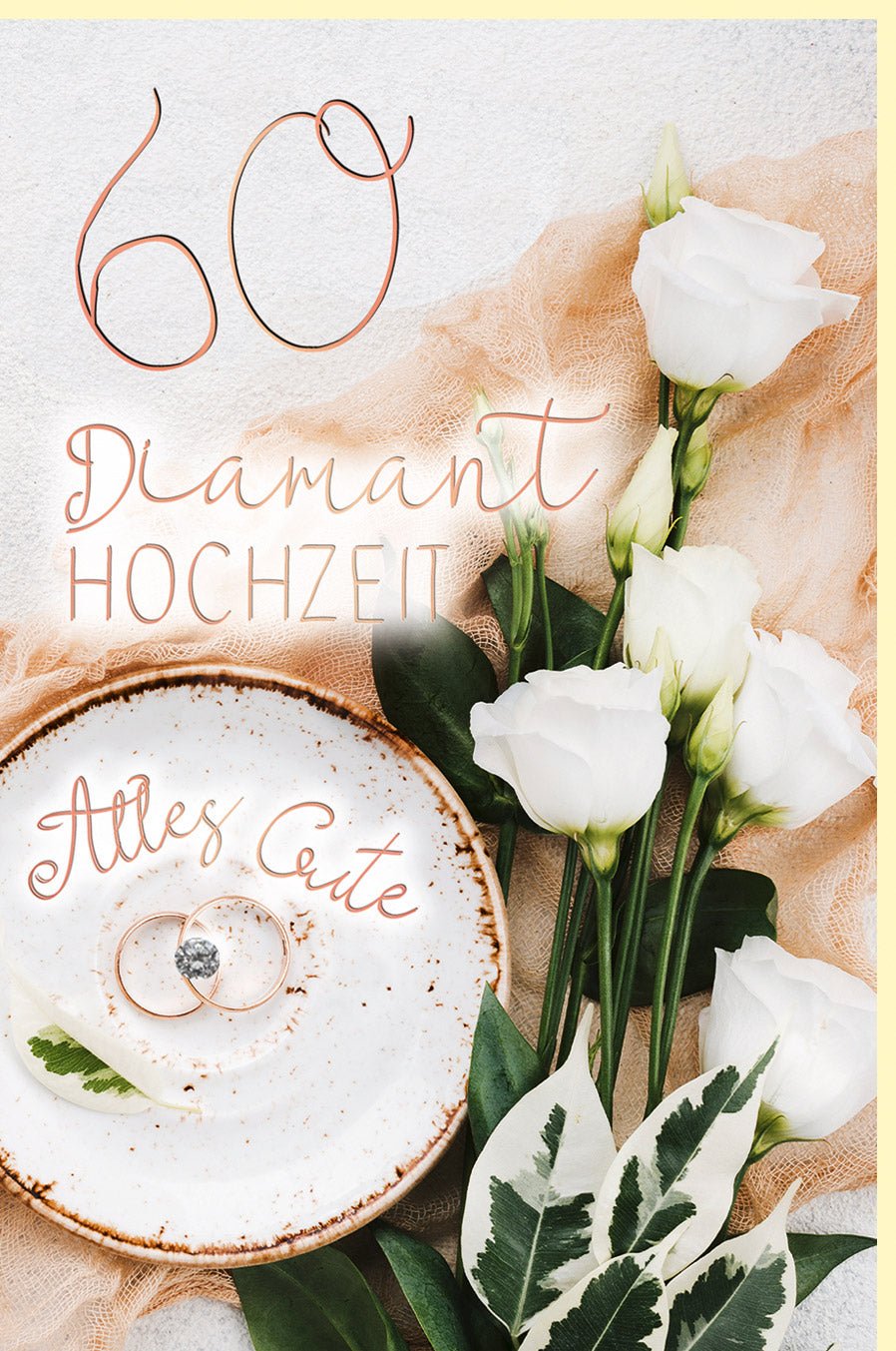Feiere 60 Jahre Liebe mit unserer exquisiten Doppelkarte zur Diamanthochzeit. Diese Karte besticht durch eine elegante Applikation und zeigt stilvoll arrangierte weiße Rosen neben einem Ringpaar auf einem zarten Teller. Der Schriftzug "Alles Gute" verleiht der Karte eine persönliche Note. Perfekt für Paare, die diesen besonderen Meilenstein gebührend würdigen möchten. Ein edles Geschenk für Freunde oder Familie!