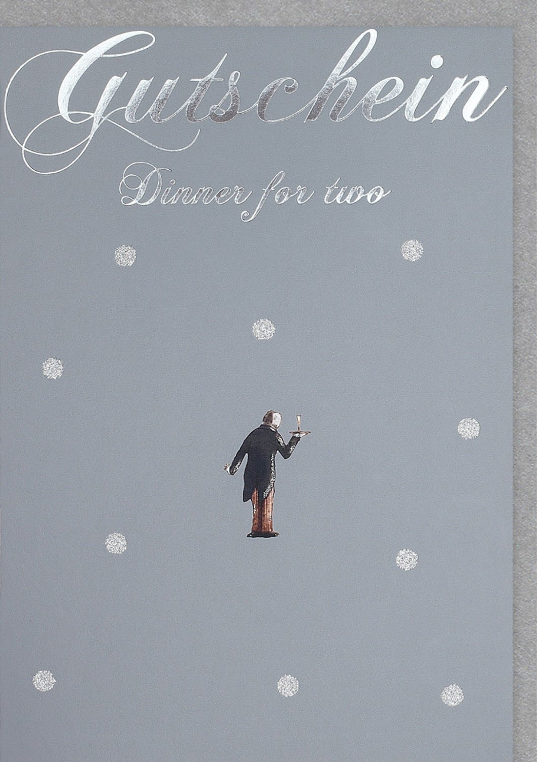 Entdecke unsere elegante Doppelkarte "Gutschein - Dinner for Two". Diese stilvolle Karte besticht durch eine edle Folienprägung und funkelnden Glitzerlack, der die kleinen Details zum Strahlen bringt. Ein charmantes Motiv mit einem Kellner verleiht der Karte einen besonderen Touch. Ideal für Paare oder Freunde, die sich über ein gemeinsames Abendessen freuen möchten. Perfekt für besondere Anlässe!