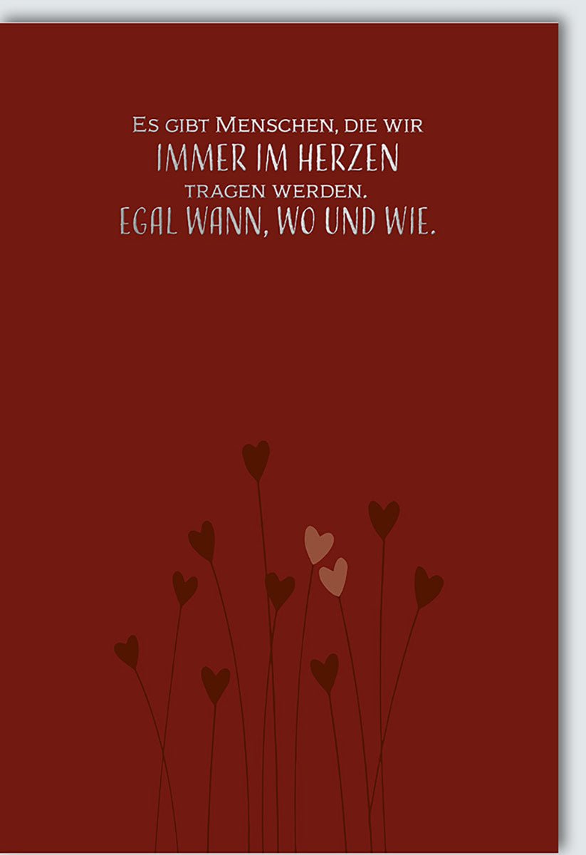 Kondolenzkarte Beileidskarte Es gibt Menschen die wir immer im Herzen tragen werden egal wann wo und wie rote Karte mit Herzmotiven und Blumen mit Umschlag