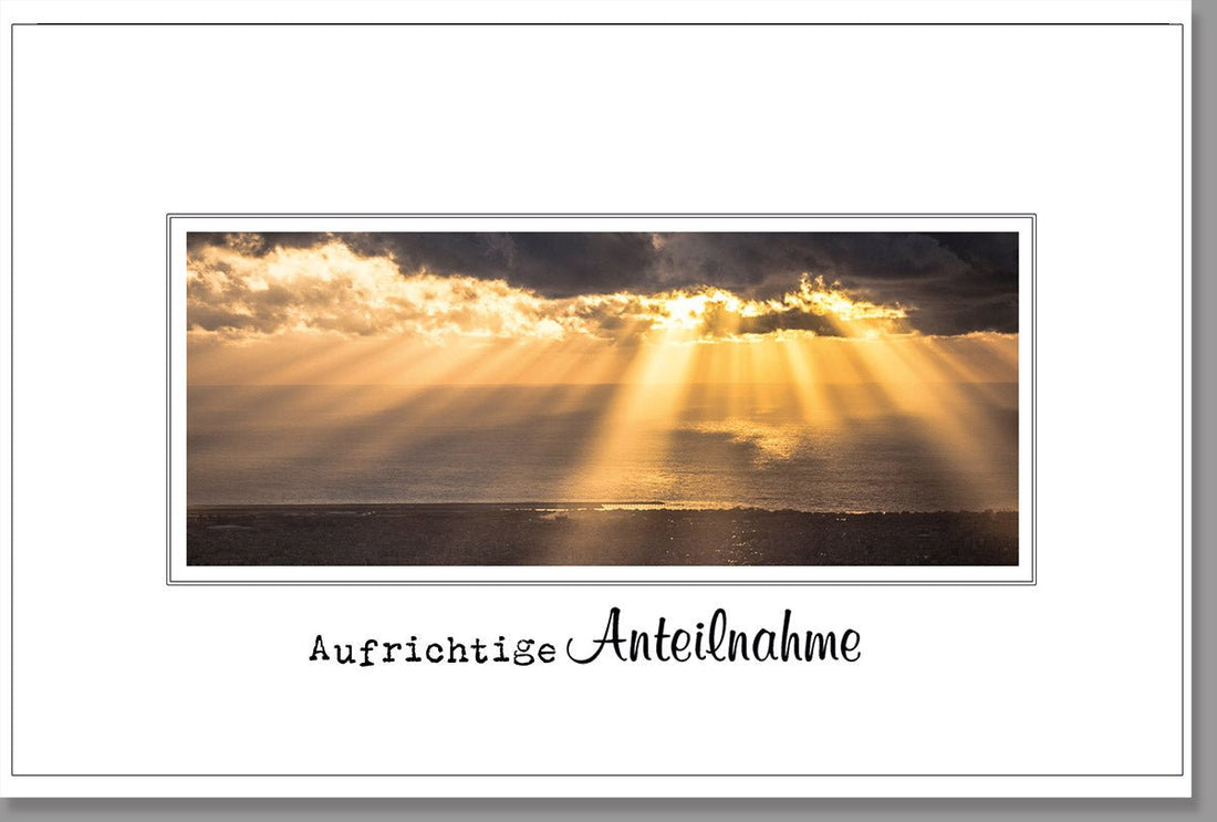 Kondolenzkarte Beileidskarte Trauerkarte mit Sonnenstrahlen über dem Meer und Aufschrift aufrichtige Anteilnahme stilvolle Gestaltung für Trauerfälle mit Umschlag